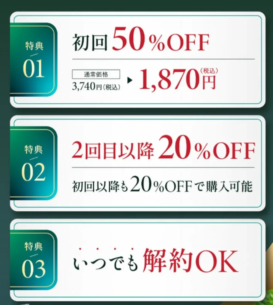 公式サイトなら初回1,870円(税込)で購入できます。楽天やAmazonの3,740円と比べると、なんと1,870円もお得なんです。約50%OFFという割引率は、見逃せませんよね。